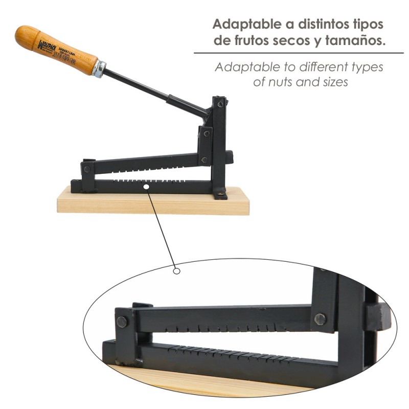 - Sistema de muelle con palanca diseñado para partir frutos secos rápidamente sin esfuerzo alguno.